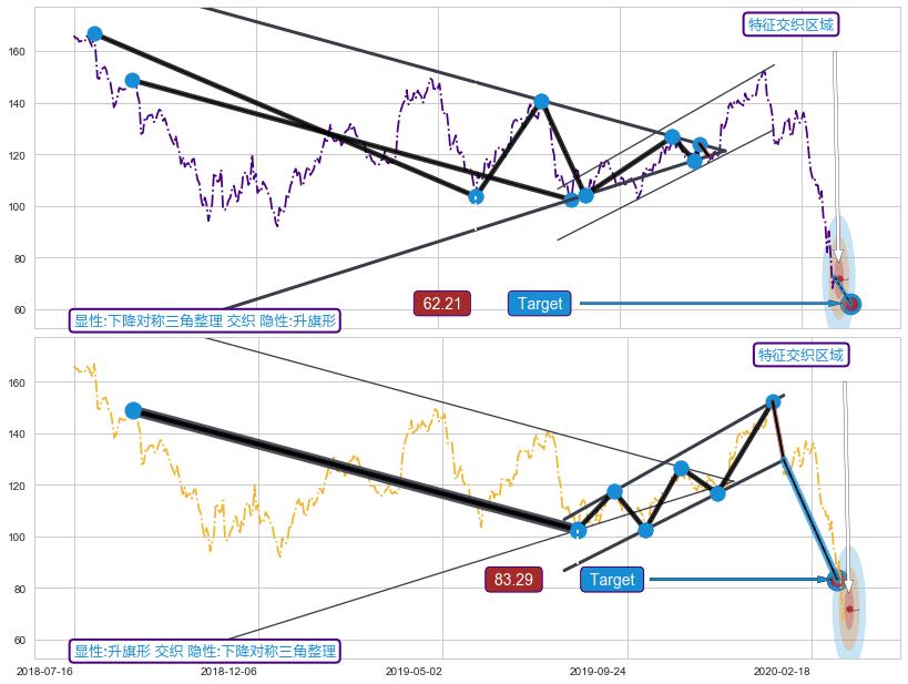 ➢ 下降对称三角整理:猜想预期下跌目标target即将达成,随后猜想强支撑来临,预期反弹上涨(均值回复)