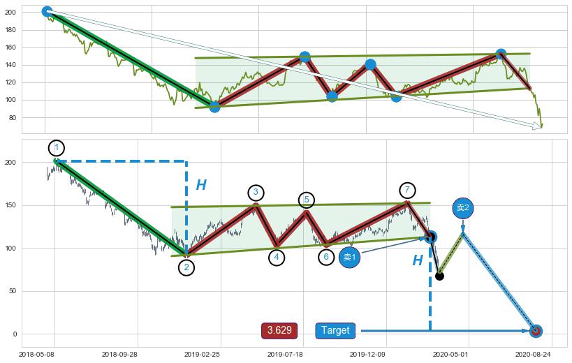 ➣ 升旗形:下跌target达成后 → 猜想下跌动能竭尽反转上涨 → 机会信号 → 大趋势均值回复