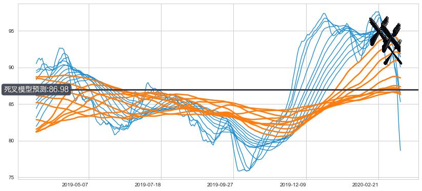 ➣ 60小时均线于(2020-02-21: 94.87)形成【死叉】基于【死叉历史模型】预测死叉后最低波谷价格: 86.57, 死叉后最低价格70.78,已经下跌超出预测最低波谷价格, 预期反弹