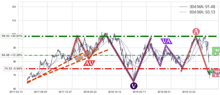 ♘ 阻力价格位98.42,可信任强度99.00%,距离最后交易2020-03-13形成的收盘价格75.24相差 +30.81%