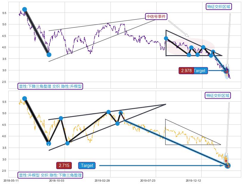 ➣ 下降三角整理:下跌target达成后 → 猜想下跌动能竭尽反转上涨 → 机会信号 → 大趋势均值回复