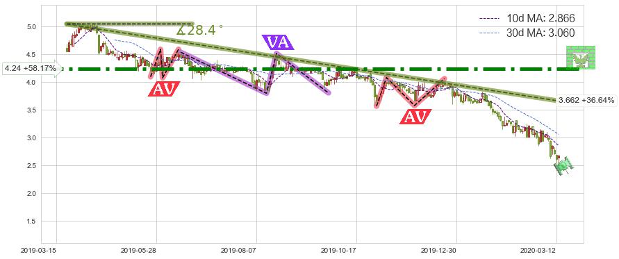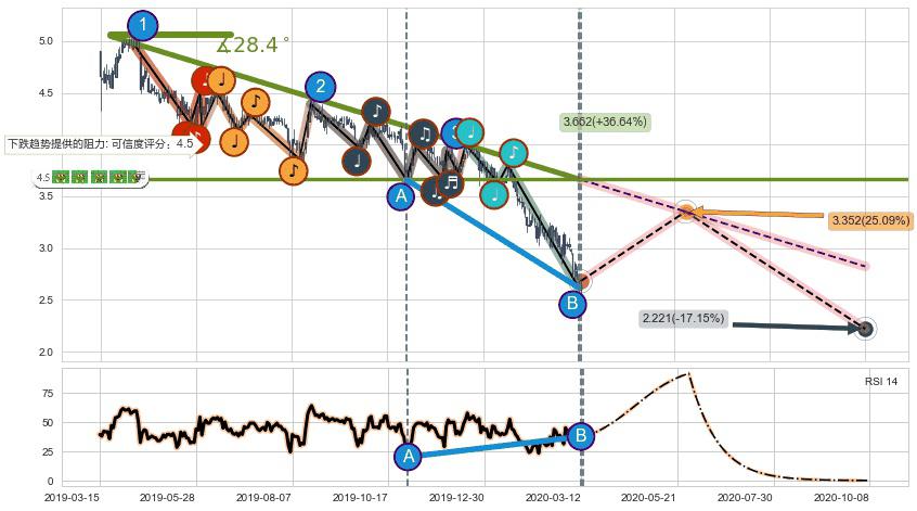 ♘ 阻力价格位4.24,可信任强度96.25%,距离最后交易2020-03-13形成的收盘价格2.680相差 +58.17%