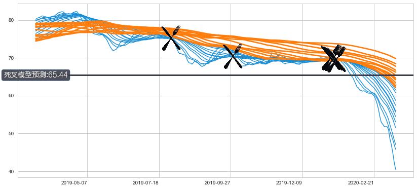 ➣ 65小时均线于(2020-01-13: 69.40)形成【死叉】基于【死叉历史模型】预测死叉后最低波谷价格: 65.23, 死叉后最低价格37.18,已经下跌超出预测最低波谷价格, 预期反弹