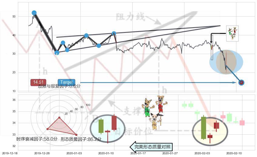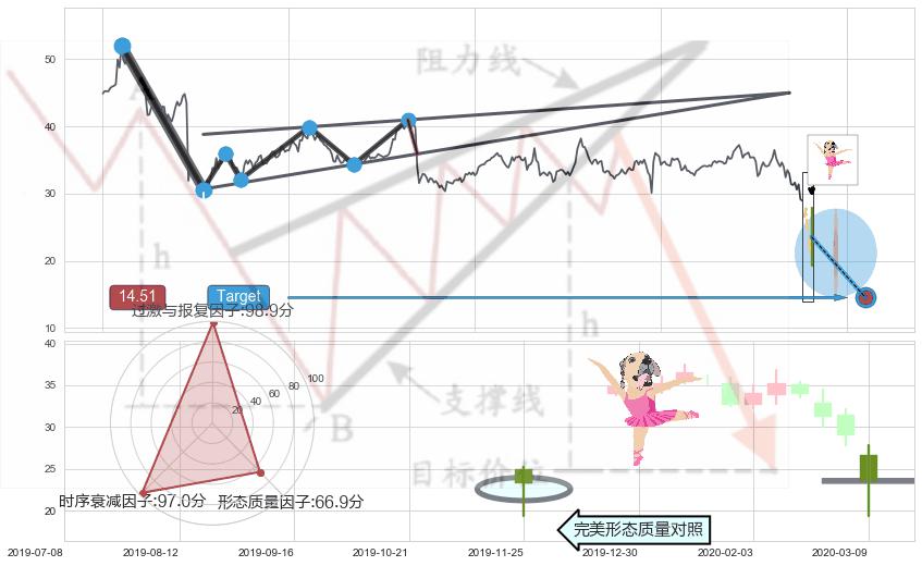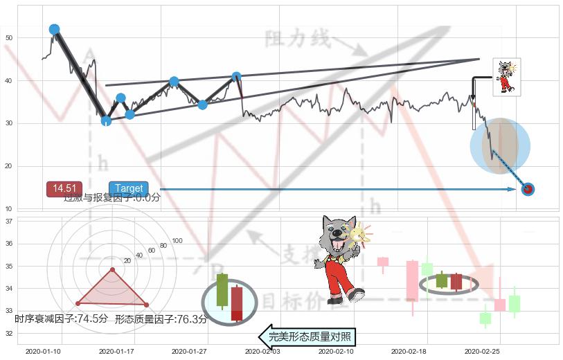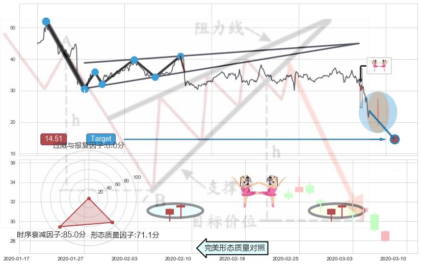 从2018-09-20至2020-03-13,共包含372个交易日,阶段股价下跌-62.11%,阶段股价变动位移路程比: 1 : 10,下跌趋势角度: 26.4,2018-11-09向↘︎形成缺口,跳空下跌-26.60%˚