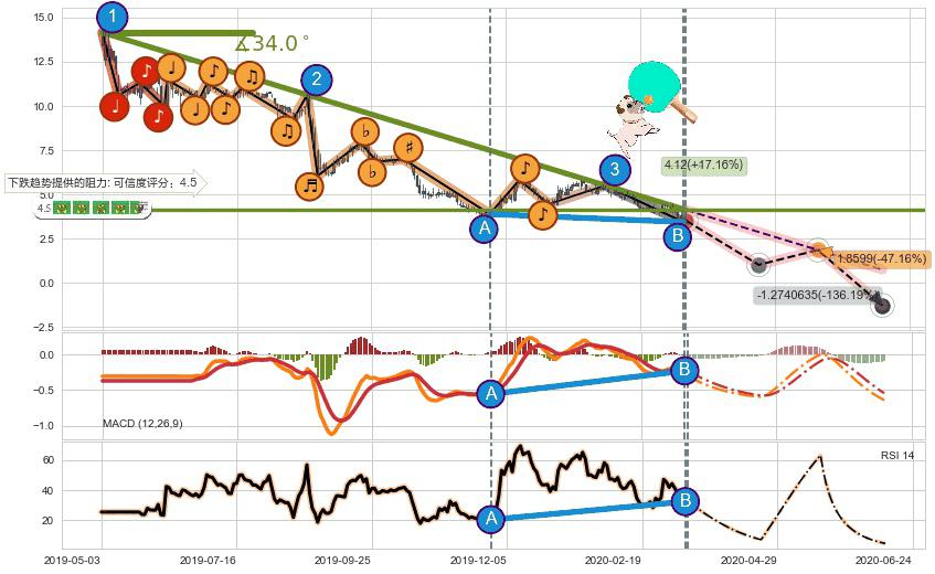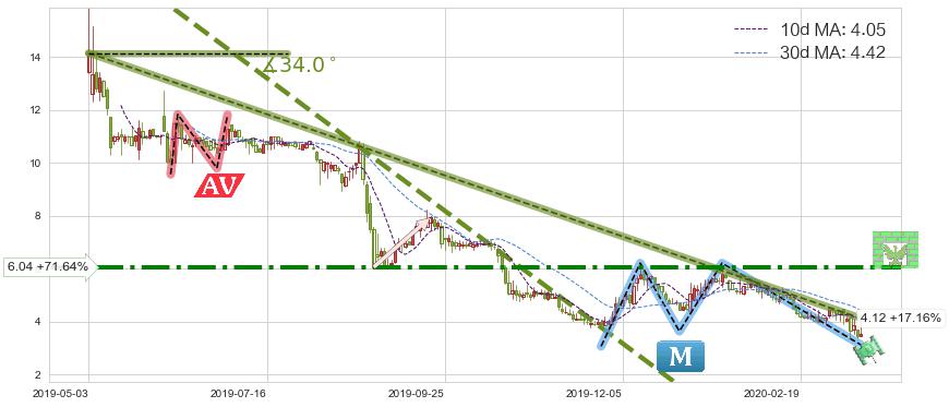 🦴 长线均值回复组合短线趋势跟踪[强阻力信号]2019-05-03-2020-03-13下跌趋势依然成立(下跌趋势跟踪依然存在),短线价格略微上行反弹(均值回复猜想),即将接近下跌趋势提供的未破位阻力价格:4.12。