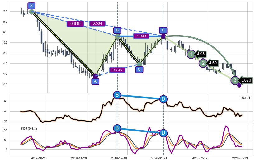 ➢ 谐波价格D点比B点高 ⤴,【KDJ】指标D点比B点低 ⤵️