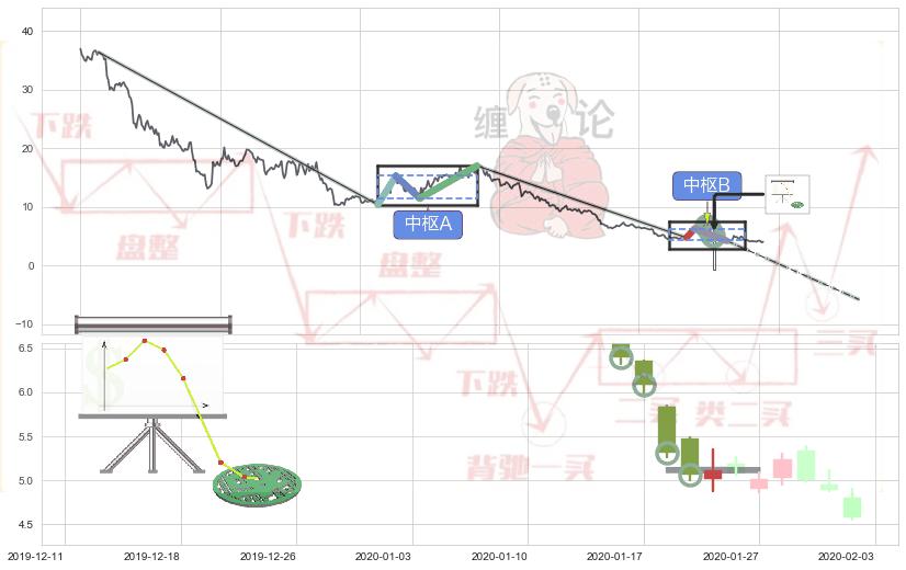 ➢ 缠论中枢点:猜想破位中枢B后持续下拉 → 下跌 → 破位中枢B支撑 → 持续趋势跟踪
