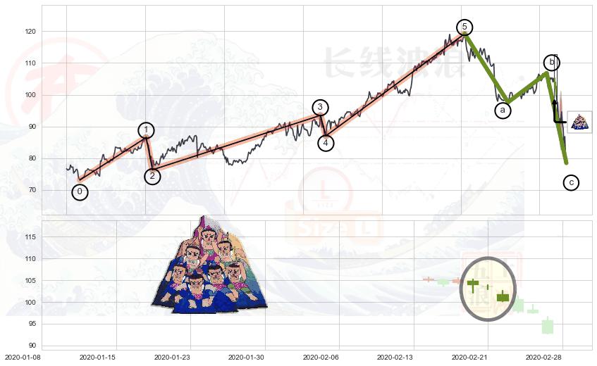 ➢ 波浪理论:猜想击穿破位c点后继续下跌 → 下跌 → 风险信号 → 小趋势跟踪