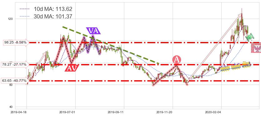 ♘ 支撑价格位98.25,可信任强度72.00%,距离最后交易2020-03-13形成的收盘价格107.47相差 -8.58%