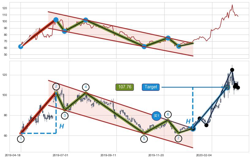 ➣ 降旗形:上涨目标target已达成:猜想强阻力位临近,预期回调下跌(均值回复)