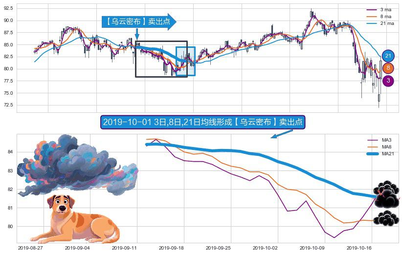 ⚀ 2019-09-12日-2019-10-17日显现 3日-8日-21日均线 【乌云密布】卖出点 看空信号,后市看跌,卖出