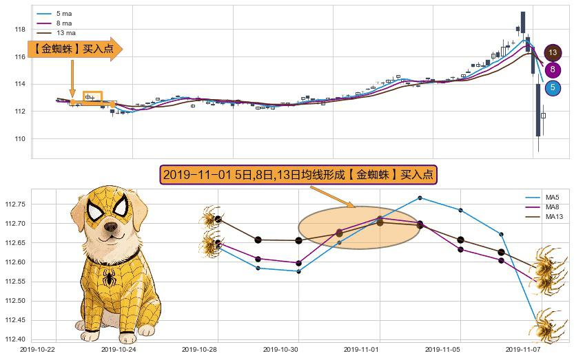 形态多维评估: ⚀ 2019-11-01日显现 5日-8日-13日均线 【金蜘蛛】买入点 看多信号,后市看涨,买入