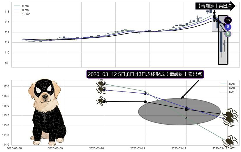 形态多维评估: ⚀ 2020-03-12日显现 5日-8日-13日均线 【毒蜘蛛】卖出点 看空信号,后市看跌,卖出