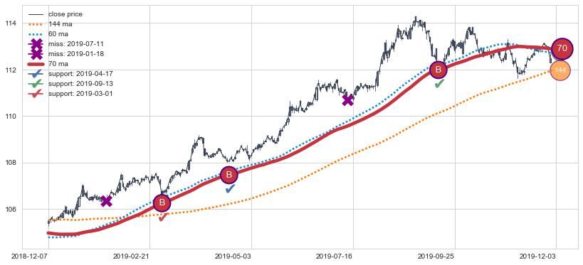 上涨趋势2018-12-07-2019-12-03,均线70确认关键支撑3处