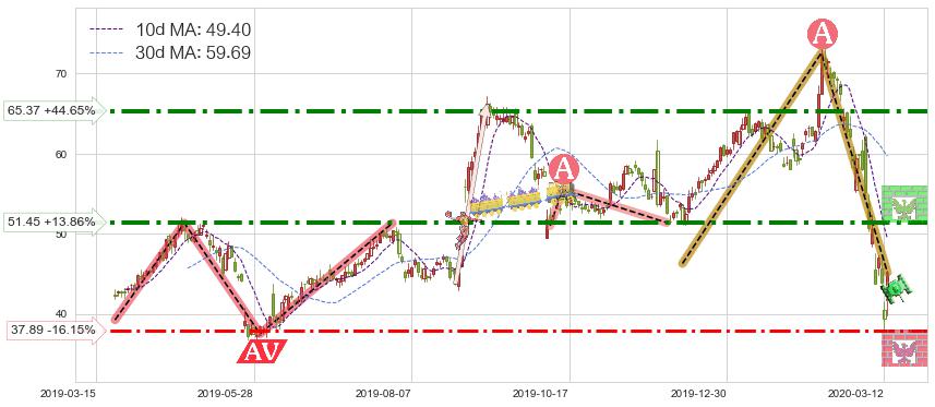 ♘ 阻力价格位51.45,可信任强度76.27%,距离最后交易2020-03-13形成的收盘价格45.19相差 +13.86%
