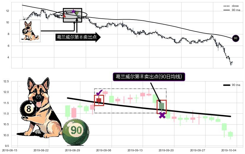 形态多维评估: ⚀ 2019-09-18-日显现 葛兰威尔均线 90日均线 第⑧卖出点 下降趋势的中继信号,后市看跌,卖出信号