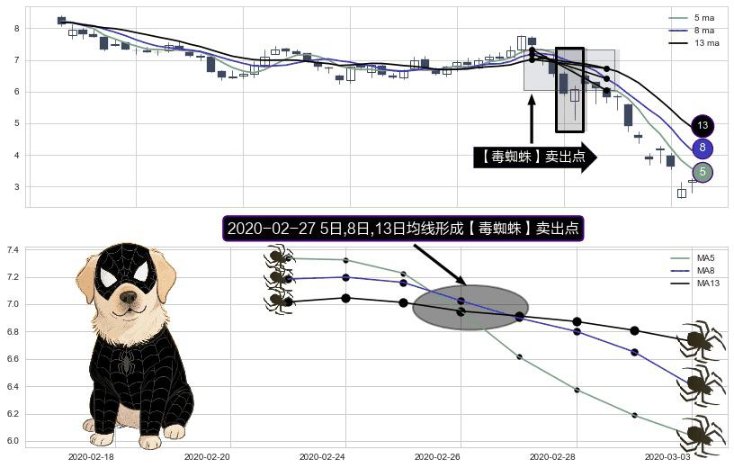 形态多维评估: ⚀ 2020-02-27日显现 5日-8日-13日均线 【毒蜘蛛】卖出点 看空信号,后市看跌,卖出