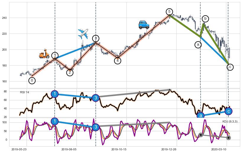 ➣ 第一, 三驱动浪端点:【KDJ】走势出现【常规背离 & 反转信号】背离程度65.69%,背离夹角角度83.3˚,背离程度较大