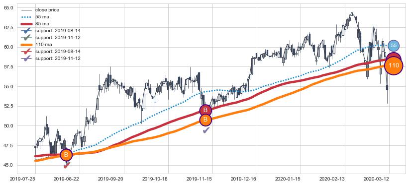上涨趋势2019-07-25-2020-03-12,均线85, 110确认关键支撑2处