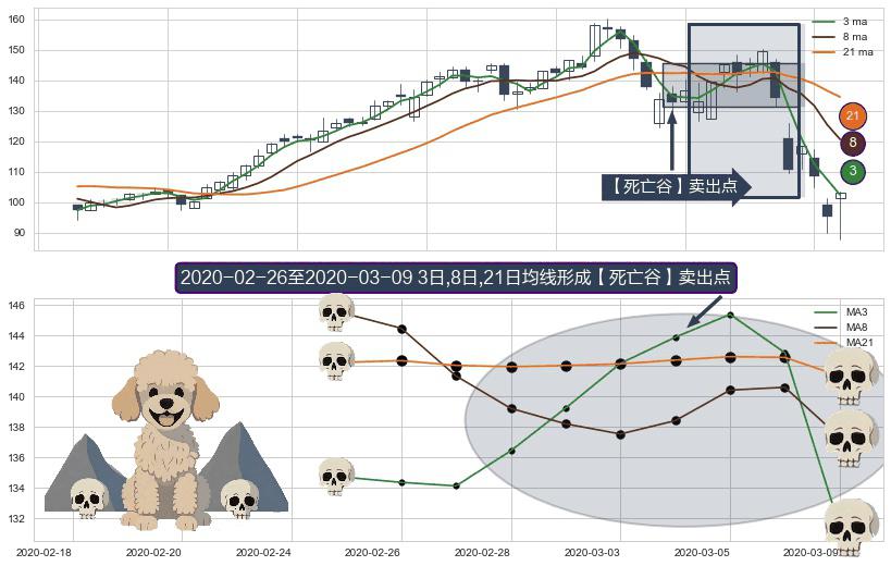⚀ 2020-02-27-日至2020-03-09-日显现 3日-8日-21日均线 【死亡谷】卖出点 看空信号,后市看跌,卖出