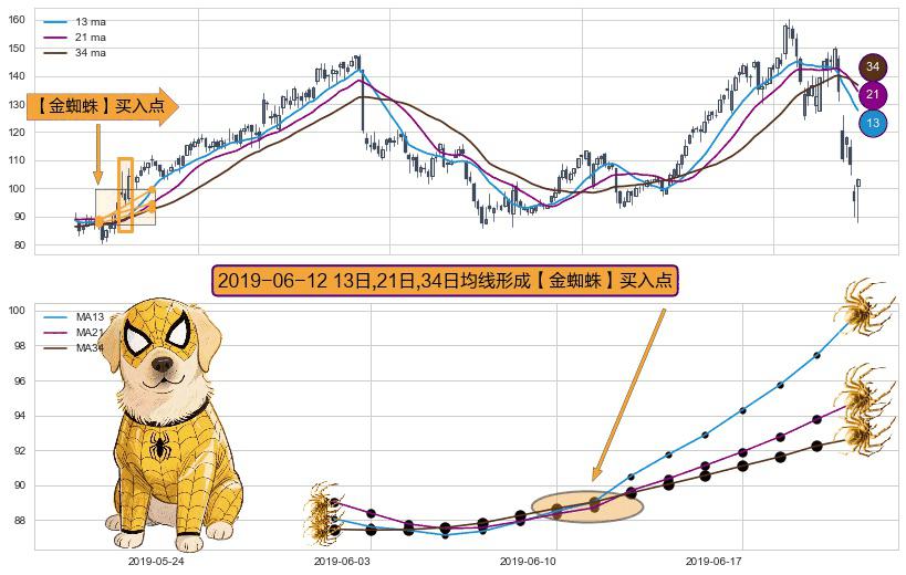 ⚀ 2019-06-12日显现 13日-21日-34日均线 【金蜘蛛】买入点 看多信号,后市看涨,买入