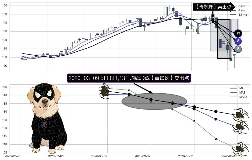 ⚀ 2020-03-09日显现 5日-8日-13日均线 【毒蜘蛛】卖出点 看空信号,后市看跌,卖出