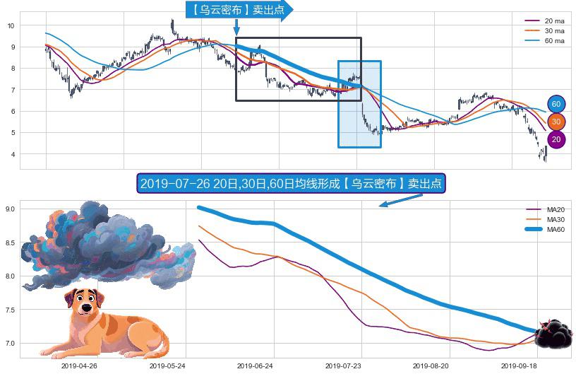 ⚃ 【乌云密布】卖出点长时间对 牛 市转 熊 市进行确认,且均线压制价格走势,但信号发出时间较长,属于【迟滞】看空卖出信号