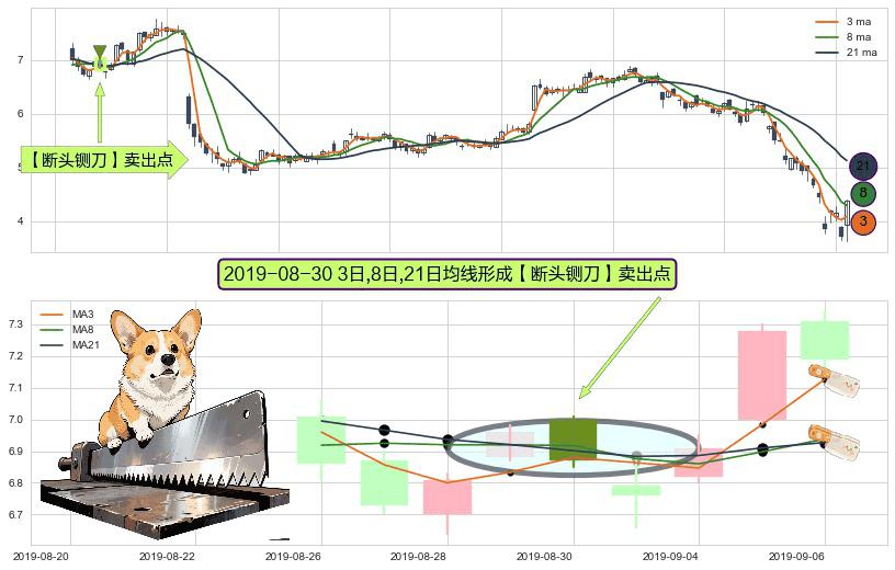 形态多维评估: ⚀ 2019-08-30日显现 3日-8日-21日均线 【断头铡刀】卖出点 看空信号,后市看跌,卖出