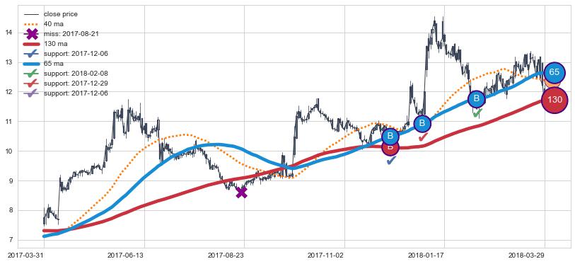 上涨趋势2017-03-31-2018-03-29,均线65, 130确认关键支撑3处
