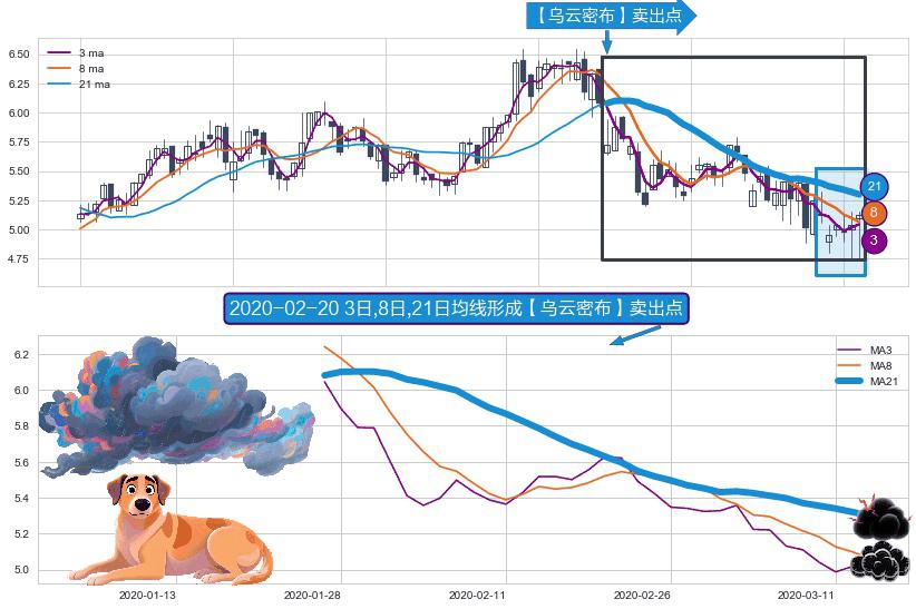 ⚀ 2020-01-27日-2020-03-13日显现 3日-8日-21日均线 【乌云密布】卖出点 看空信号,后市看跌,卖出