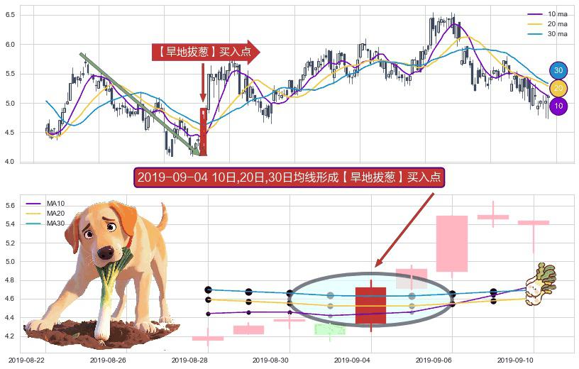 ⚀ 2019-09-04日显现 10日-20日-30日均线 【旱地拔葱】买入点 看多信号,后市看涨,买入