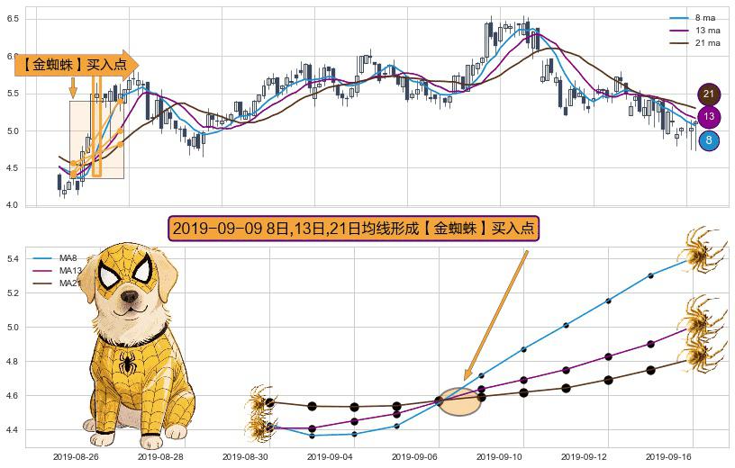 ⚀ 2019-09-09日显现 8日-13日-21日均线 【金蜘蛛】买入点 看多信号,后市看涨,买入