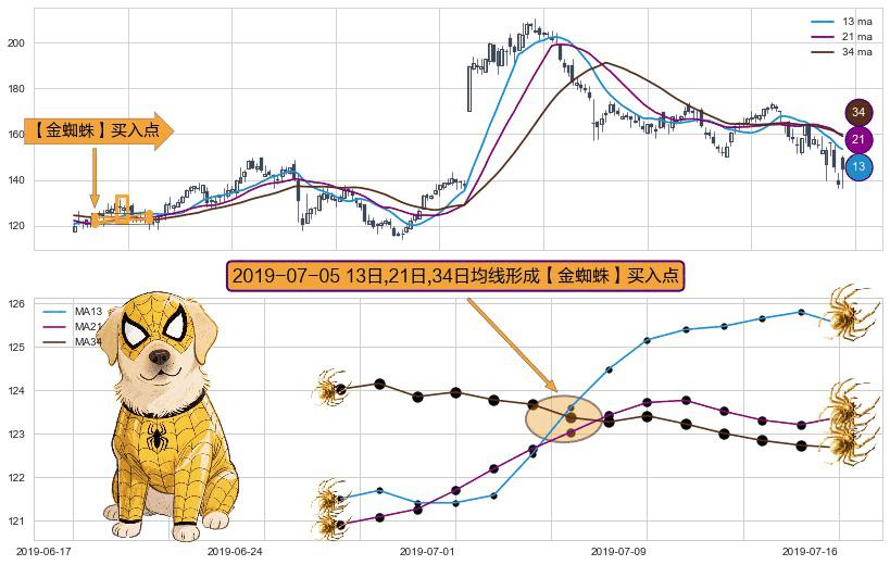 形态多维评估: ⚀ 2019-07-05日显现 13日-21日-34日均线 【金蜘蛛】买入点 看多信号,后市看涨,买入