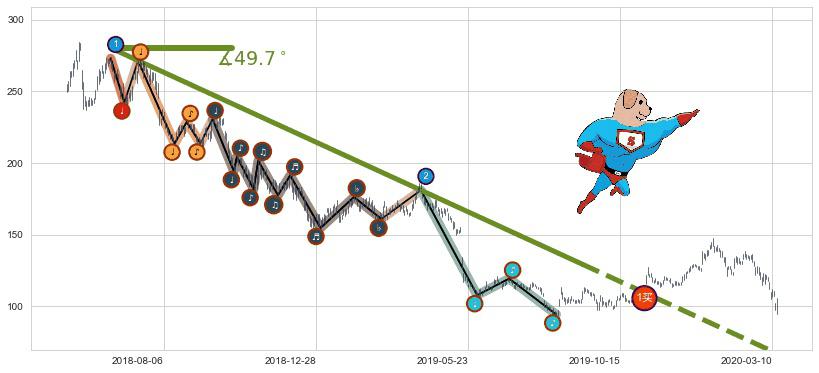从2018-08-27至2019-03-20,共包含141个交易日,阶段股价下跌-26.34%,阶段股价变动位移路程比: 1 : 9,下跌趋势角度: 66.7