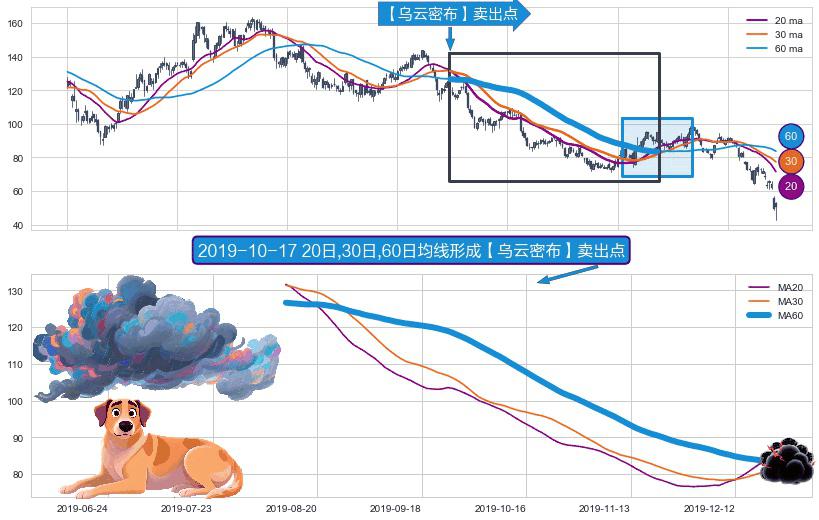 ⚃ 【乌云密布】卖出点长时间对 牛 市转 熊 市进行确认,且均线压制价格走势,但信号发出时间较长,属于【迟滞】看空卖出信号