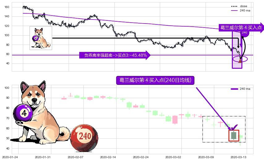 形态多维评估: ⚀ 2020-03-12-日显现 葛兰威尔均线 240日均线 第④买入点 下降趋势均值回复的短线反弹信号,后市看涨,买进信号