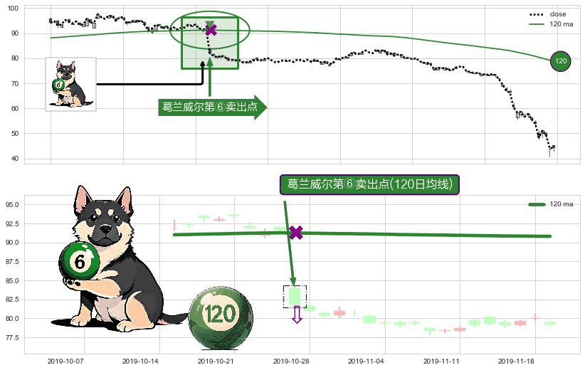 形态多维评估: ⚀ 2019-10-25-日显现 葛兰威尔均线 120日均线 第⑥卖出点 走势反转见顶信号,后市看跌,卖出信号