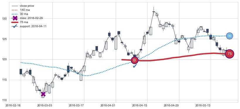 上涨趋势2016-02-18-2016-05-20,均线75确认关键支撑1处