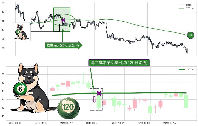 形态多维评估: ⚀ 2019-09-23-日显现 葛兰威尔均线 120日均线 第⑥卖出点 走势反转见顶信号,后市看跌,卖出信号