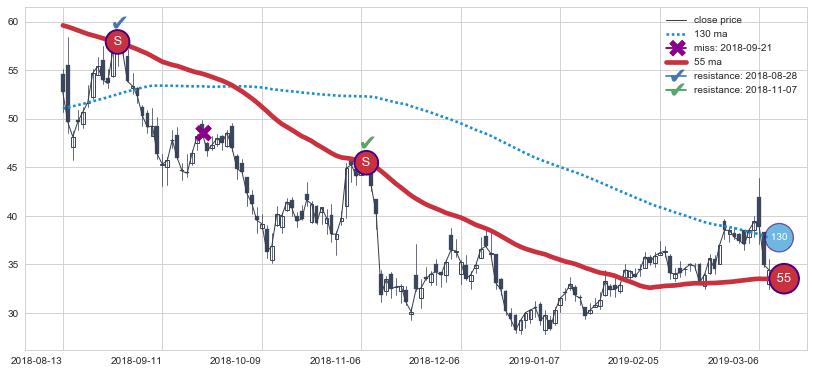 下跌趋势2018-08-13-2019-03-08,均线55确认关键阻力2处