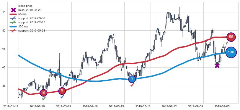 上涨趋势2019-01-18-2019-09-05,均线130, 55确认关键支撑3处