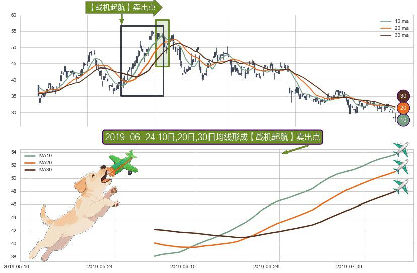 形态多维评估: ⚀ 2019-06-03日-2019-07-15日显现 10日-20日-30日均线 【战机起航】卖出点 看空信号,后市看跌,卖出