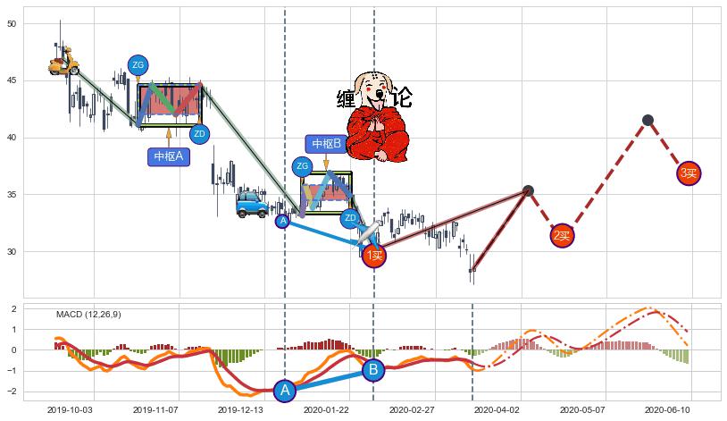 ➣ 【中枢B】:2019-12-31-2020-01-22,中枢由5笔构成,共15交易日, ZG=35.74, ZD=34.89