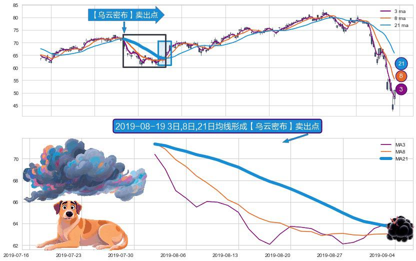 形态多维评估: ⚀ 2019-08-01日-2019-09-04日显现 3日-8日-21日均线 【乌云密布】卖出点 看空信号,后市看跌,卖出