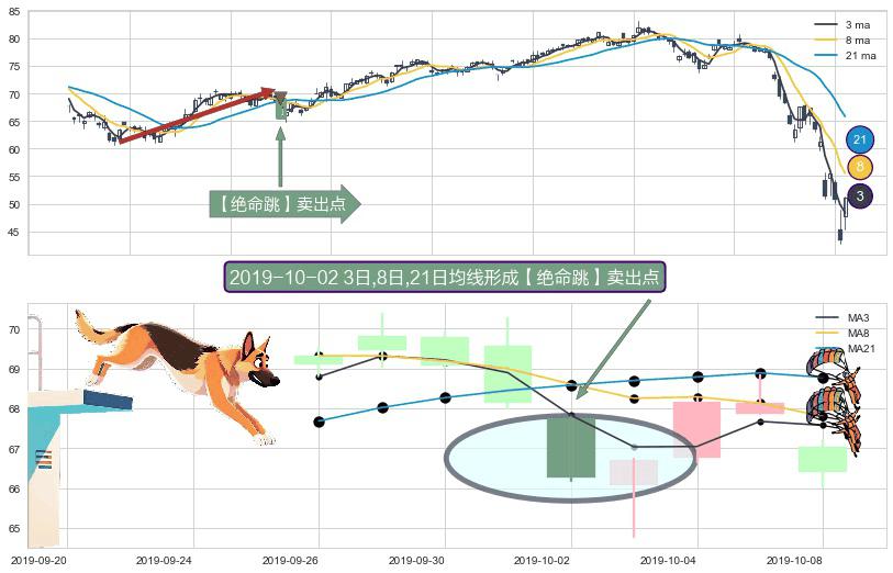 形态多维评估: ⚀ 2019-10-02日显现 3日-8日-21日均线 【绝命跳】卖出点 看空信号,后市看跌,卖出