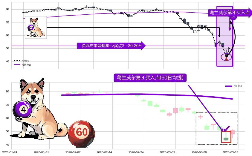 形态多维评估: ⚀ 2020-03-12-日显现 葛兰威尔均线 60日均线 第④买入点 下降趋势均值回复的短线反弹信号,后市看涨,买进信号