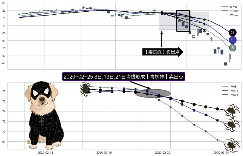 形态多维评估: ⚀ 2020-02-25日显现 8日-13日-21日均线 【毒蜘蛛】卖出点 看空信号,后市看跌,卖出