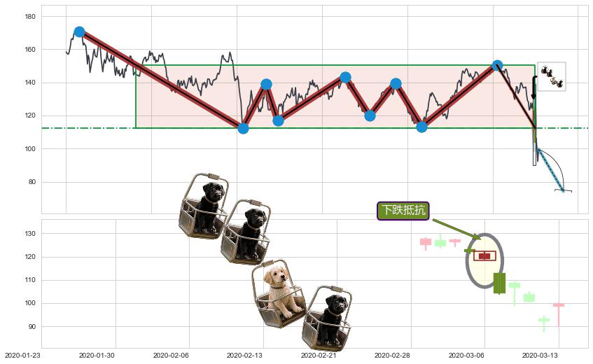 | 3 🅚:【毒蜘蛛】卖出点 ➕ 📐:下跌矩形整理下行突破支撑位破位, 猜想持续下沉下跌,被突破的支撑位已变为阻力位 ☞ 看空信号 ⇥ 【均线】交织【图形】⇥ 综合量化分数: 40 | > |