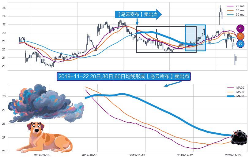 ⚀ 2019-10-09日-2020-01-09日显现 20日-30日-60日均线 【乌云密布】卖出点 看空信号,后市看跌,卖出