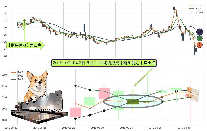 ⚀ 2019-09-04日显现 3日-8日-21日均线 【断头铡刀】卖出点 看空信号,后市看跌,卖出